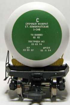 4-х-осная цистерна для бензина и светлых нефтепродуктов. Тип вагона 15-1566. Рама черная, бак бежевый, на торцах темно-зеленые круги с надписями. Сверху 1 небольшой круглый люк, площадка, к которой ведут 2 лестницы. Поручни и лестницы металлические. Металлические полосы, охватывающие и удерживающие бак на раме, выполнены отдельно из металлической тонкой полосы. Надписи: знак «РЖД», «СИБНЕФТЬ», номер «51109189», «бензин», «60т», «73,1м/куб.», «срочный возврат ст.Комбинатская З-Сиб.ж.д.», «ТО 830003 02 02», «Построен 143 03.03.94», «КР 03.03.07», «ДР 614 02.11.04», «тара 23,2т», «закрой крышку сливного прибора огнеопасно» и некоторые другие. Колесные диски цельнометаллические с затемненным покрытием. Сцепки сменные с накидной петлей. Артикул: 1566-0002. Принадлежность: РЖД. Владелец: ОАО. Номер вагона: 51109189. Эпоха: V. Длина: 128 мм. Масштаб: НО(1:87). Производитель: Онега (Латвия)